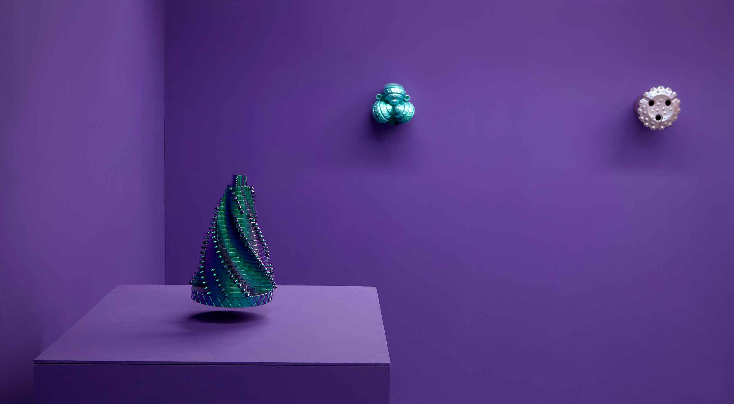 Differing from Alien Technology in terms of presentation and size, the work Spectrum (2016) can serve as an example of the illusionist temptation Al Qadiri’s works excerpt. The precise models of different drill heads lined up along the wall, shimmering in dichroic colours, mesmerisingly lure the mind into transforming these technological tools into secretive relics of alien sea creatures or rare pearls. The viewer’s imagination constantly travels between the functional reality of the models and their mystical aura.