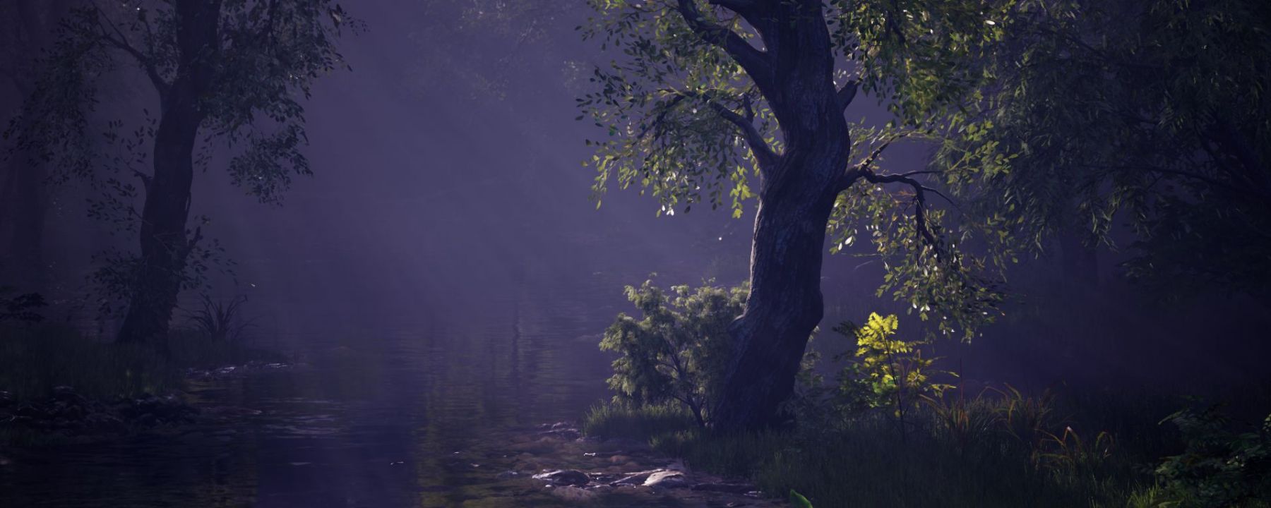 What starts with enticing soft light and water reflections takes us through an electrified swampy environment to reveal mutating textures, strobes and misty ceilings.
