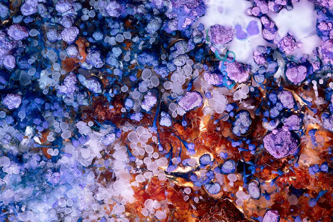 With this in mind, Schonlau, utilising chemical reactions between a silicate solution and metallic salts, worked on a photographic series Hyperorganic that shows the sculptural qualities of microstructures similar to viruses, bacteria, or spores. The pandemic is currently sparking a high public interest in virology and science, resulting in abundant visuals about the pathogen. Seeing the microscopic elements, it’s quite intriguing thinking about the permanent presence of complex microstructures surrounding us without being visible to our eyes. Schonlau continues.