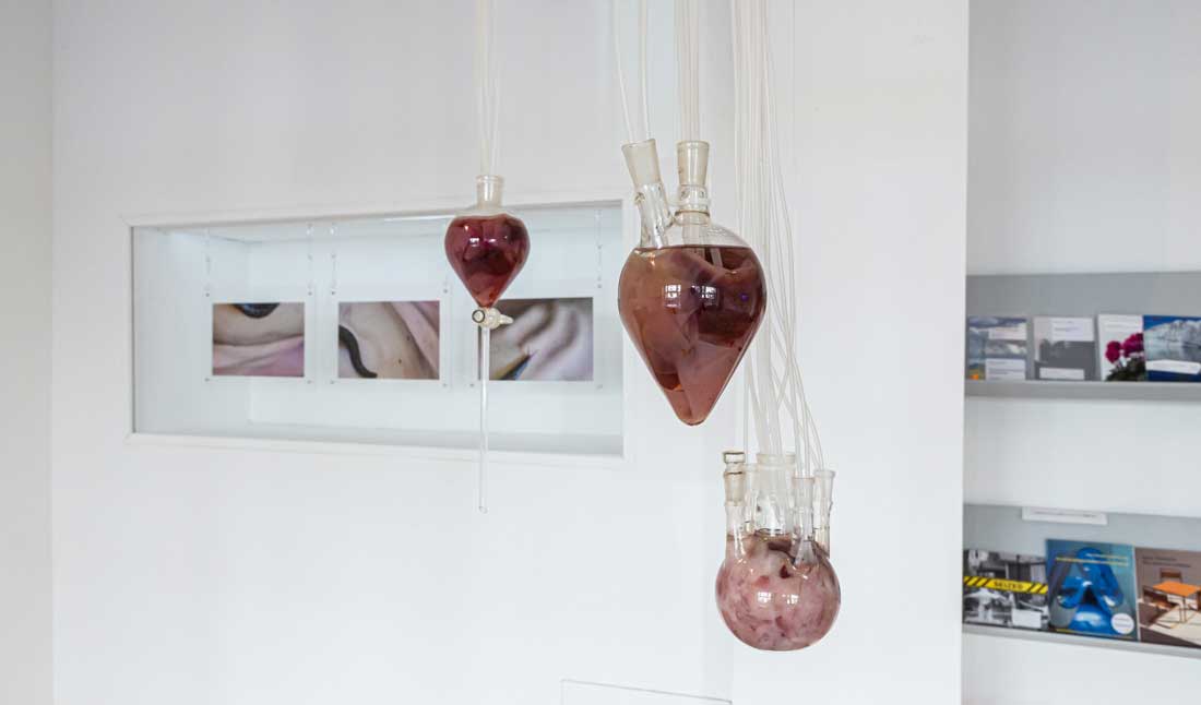 By creating new stories and narratives about caring for human and non-human life, the artists of THE CAMILLE DIARIES are, in turn, enacting the call to action found in Haraway’s text. The creative and transformative potential of these relationships is also represented in the exhibition through artistically synthesised artefacts such as Clouston’s Mud (Berlin), featuring the organisms living in mud from different areas of Berlin and Brandenburg, Jonsson’s HAEM made in collaboration with scientist Rodrigo Leite de Oliveira featuring compass made from the iron derived from 69 donated human placentas, and Rhoda’s Ourglass exposing the aesthetic and biochemical similarities of haemoglobin and chlorophyll.