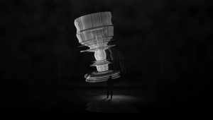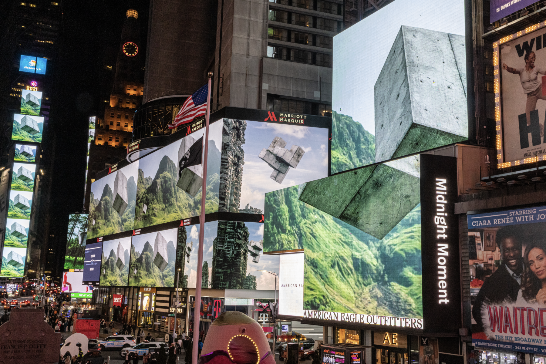One moss-covered block floats through a forest; another emerges, dripping, from a peaceful lake; another hover above sheer cliffs and remote greenery. Juxtaposed against the natural backdrop, the constructs represent life forms attempting to find purpose and context within a world where they don’t belong. As they travel through misty vistas and the ruins of cities, thousands of these blocks eventually come together, seamlessly integrating into a built structure and asking whether the individual can truly disengage from the collective. Synchronized on over 80 electronic billboards each night in December, the film both contrasts and connects to the built environment of Times Square.
