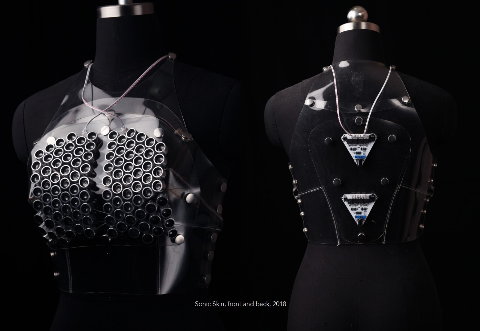 Gene Kogan’s project Abraham is an ‘autonomous artificial artist’ based on decentralised AI. In interaction with the public, the work critically reflects on promising techniques from machine learning, cryptoeconomics and computer art. Physarum Topologies by Sarah Grant uses living slime mould Physarum polycephalum to demonstrate bio-computed information routing through different topologies of computer networks. And finally, wearables such as Electric Skin and Sonic Skin by Vivian Xu explore the concept of human-machine co-evolution, offering a possible future human perception that may re-invent our relationship to the environment.