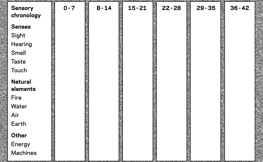 Those who wish to become cyborg, that is, create cybernetic organs to add a new sense or input, begin with a prior introspection called sensory chronology. This exercise is composed of two phases. The first phase is the creation of a chronological axis divided into seven-year periods. In this chronology, everyone analyzes the importance of the four elements of nature concerning their own biological senses. There is also the possibility of including sensory memories inspired by supernatural phenomena or anecdotes with machines and other artefacts as part of this chronology.