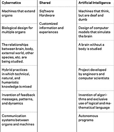 Another difference is that AI is presented as a project developed by engineers and computer scientists, in which the human sciences are excluded. In contrast, the practices of cybernetics are interdisciplinary since they arise from the mixture between computer science and engineering with biology, sociology, ethology, and philosophy [2].