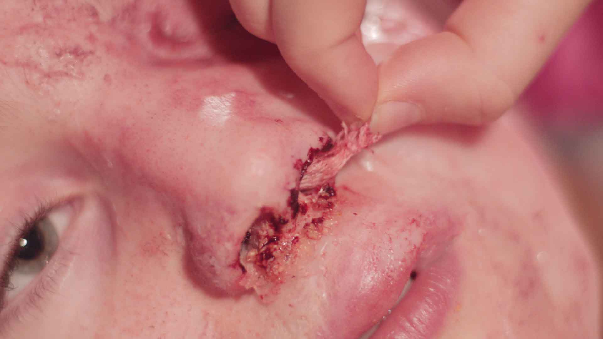 Questions around bodily ownership, autonomy and control spill into Simnett’s next chapter, Blood. Isabel returns as the central protagonist undergoing an operation to remove the swollen turbinate bones inside her nose. Again, Simnett uses a scrim to depict a corporeal interior that is both intimate and warm, womb-like and yet disconcertingly alien, even threatening. Two girls, playing both Isabel’s friends and her turbinate bones, spin Isabel while she begs them to stop. Isabel’s autonomy over her body is undermined and she is overcome by symptoms such as nosebleeds, stomach cramps and headaches. Yet while her turbinate bones are depicted as a threat, they remain intimate kin, singing ‘But we belong to your interior and you cut us out. / Without us you’re just a cavity, a sack of depravity’. In her analysis of Blood, Filipa Ramos asks: