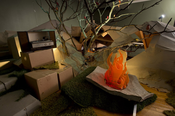 My installations and other site-specific projects take what has become familiar, or what we know to be real, and repackage it; a rotating tree, a floating shopping cart, or maybe it’s an assemblage of Christmas trees, shag carpet and cardboard boxes that standing in for a landscape.