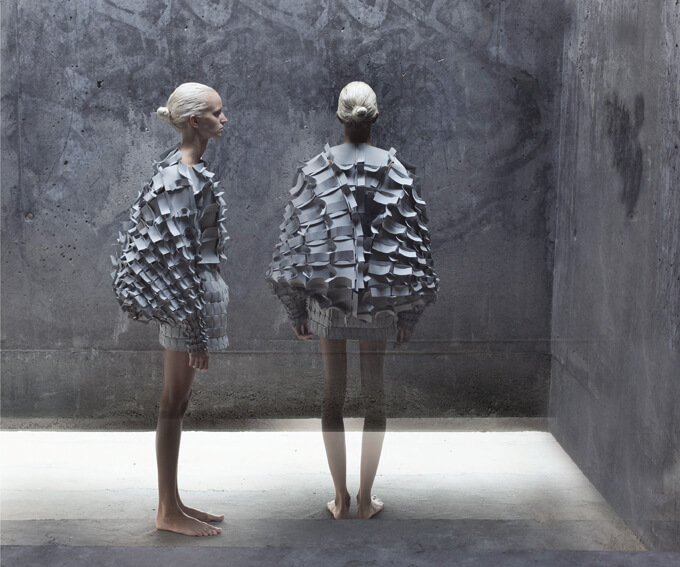 Inspired by the cathedral of St. Jacob in Šibenik, OBJECT 12-1/13-5 is a collection of garments developed without sewing and made from a unique kind of interlocked segments.